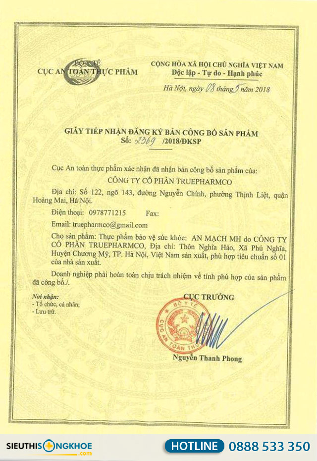 An Mạch MH được Bộ Y tế cấp giấy chứng nhận chính là bằng chứng về việc sản phẩm đã được kiểm chứng về chất lượng cũng như về an toàn cho sức khỏe.Giấy chứng nhận An Mạch MH